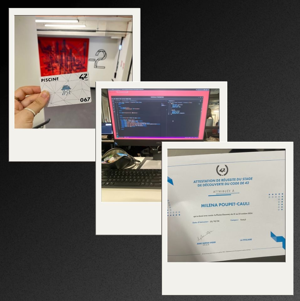 Afterwards I partecipated in a Piscine Discovery at 42, during which I discovered a bit of web developpement (Shell, HTML, CSS & JavaScript).